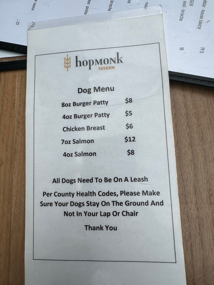 On my wishlist is a Dog Menu at some of the venues. Here is the pet menu available at Hopmonk in Novato.